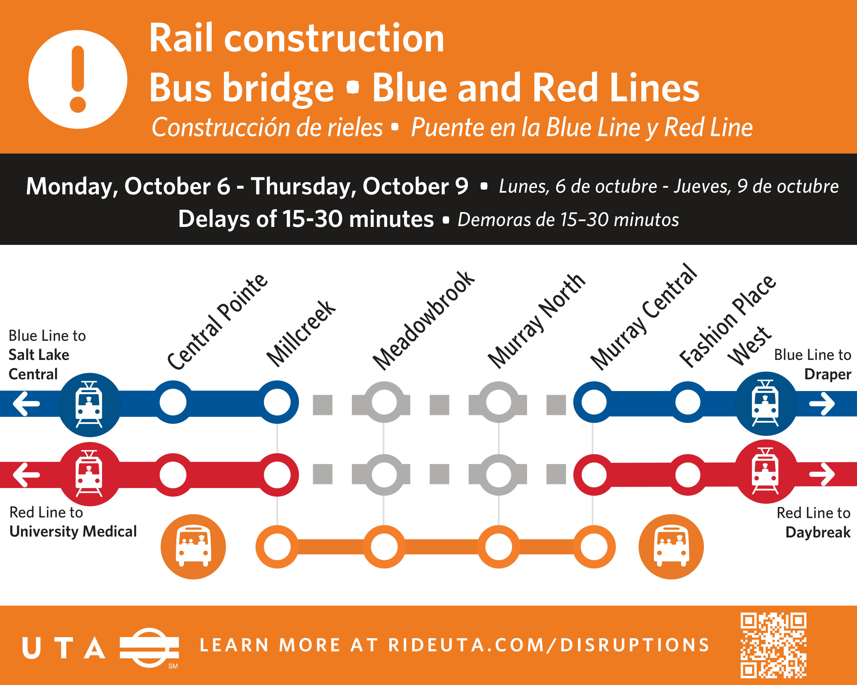 - A bus bridge will be in place between Midvale Center and Sandy Civic Center stations.